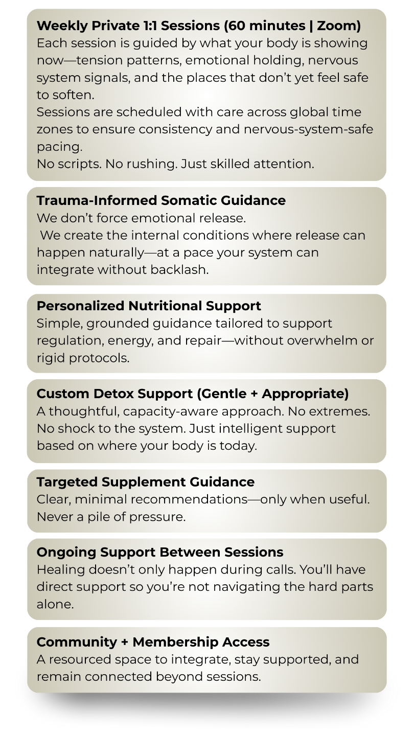 This is a globally accessible, private virtual mentorship, supporting clients across time zones who are ready for trauma-informed nervous system healing without location-based limitations.